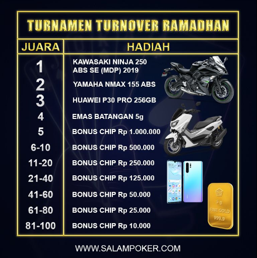 Situs Poker Online SalamPoker juga memberikan berbagai hadiah menarik yang bisa kalian raih oleh siapa pun termasuk anda yang baru saja bergabung disitus ini, berikut akan kami sajikan beberapa hadiah yang bisa kalian dapatkan dalam promo event rahmadan ini.